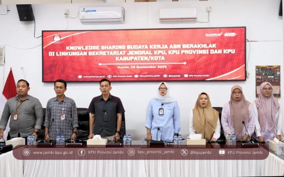 Jambi, Komisi Pemilihan Umum (KPU) Provinsi Jambi mengikuti kegiatan Knowledge Sharing Budaya Kerja ASN berAKHLAK yang diselenggarakan oleh KPU Republik Indonesia secara virtual melalui Zoom Meeting, Kamis (25/09/25).