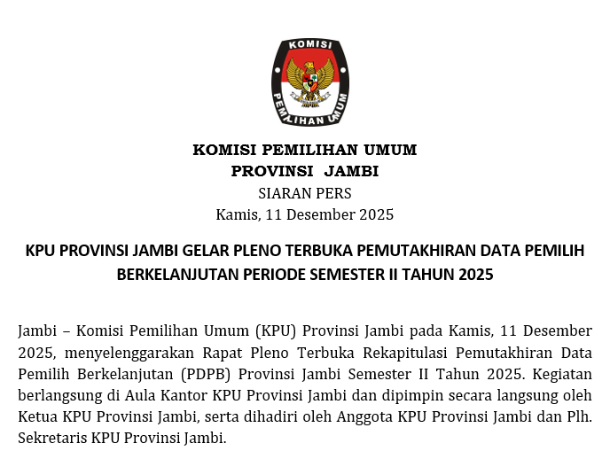 Jambi, Komisi Pemilihan Umum (KPU) Provinsi Jambi pada Kamis, 11 Desember 2025, menyelenggarakan Rapat Pleno Terbuka Rekapitulasi Pemutakhiran Data Pemilih Berkelanjutan (PDPB) Provinsi Jambi Semester II Tahun 2025. Kegiatan berlangsung di Aula Kantor KPU Provinsi Jambi dan dipimpin secara langsung oleh Ketua KPU Provinsi Jambi, serta dihadiri oleh Anggota KPU Provinsi Jambi dan Plh. Sekretaris KPU Provinsi Jambi.