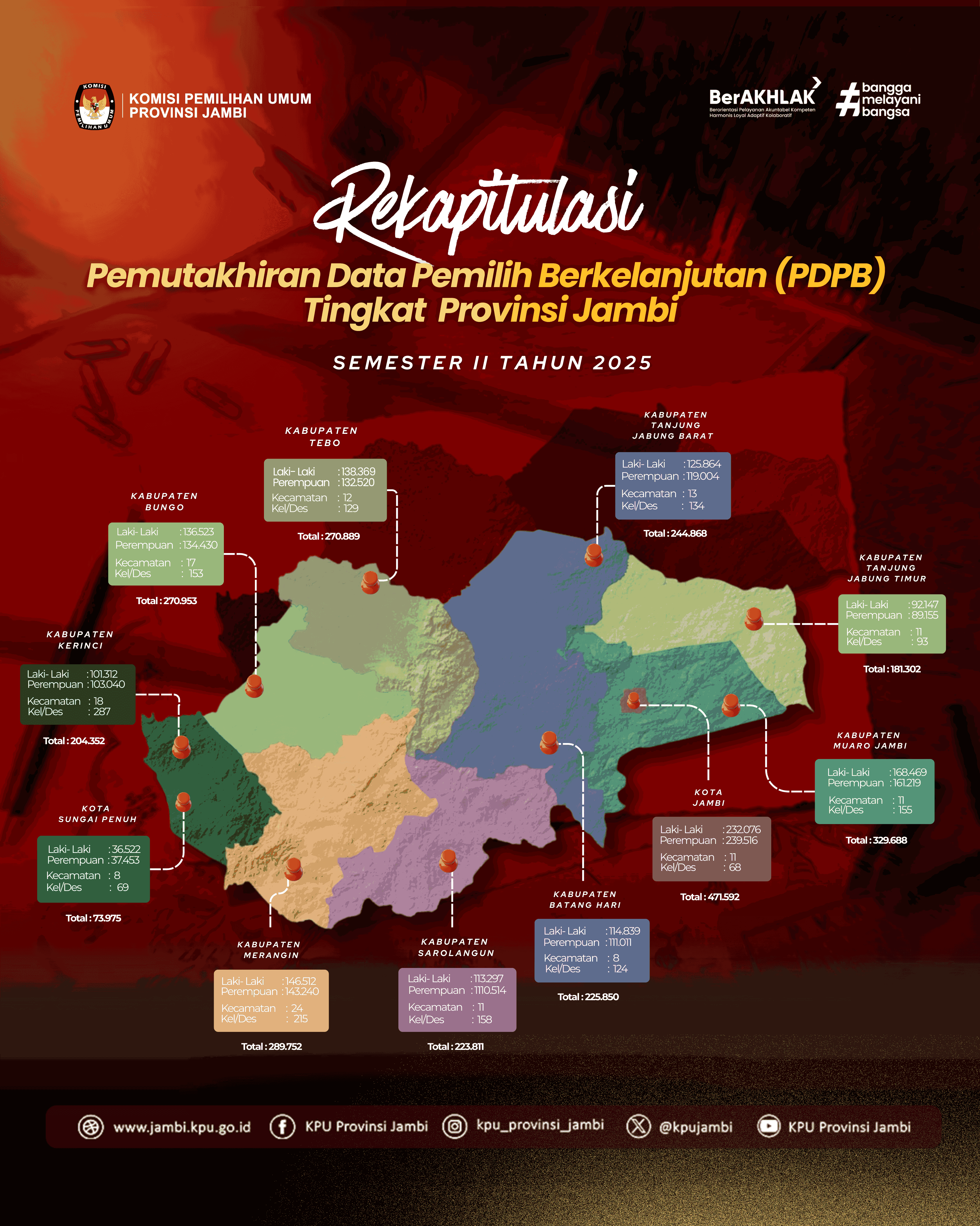 KPU Provinsi Jambi menetapkan Rekapitulasi Pemutakhiran data Pemilih Berkelanjutan untuk Semester II Tahun 2025 sejumlah 2.787.032 dengan jumlah pemilih Laki - Laki sebanyak 1.405.930 dan Perempuan sebanyak 1.381.102, yang mengalami peningkatan dari data pemilih pada Semester I Tahun 2025 sebanyak 87.568, hasil rekapitulasi PDPB tersebut ditetapkan dengan Keputusan KPU Provinsi Jambi Nomor 35 Tahun 2025.