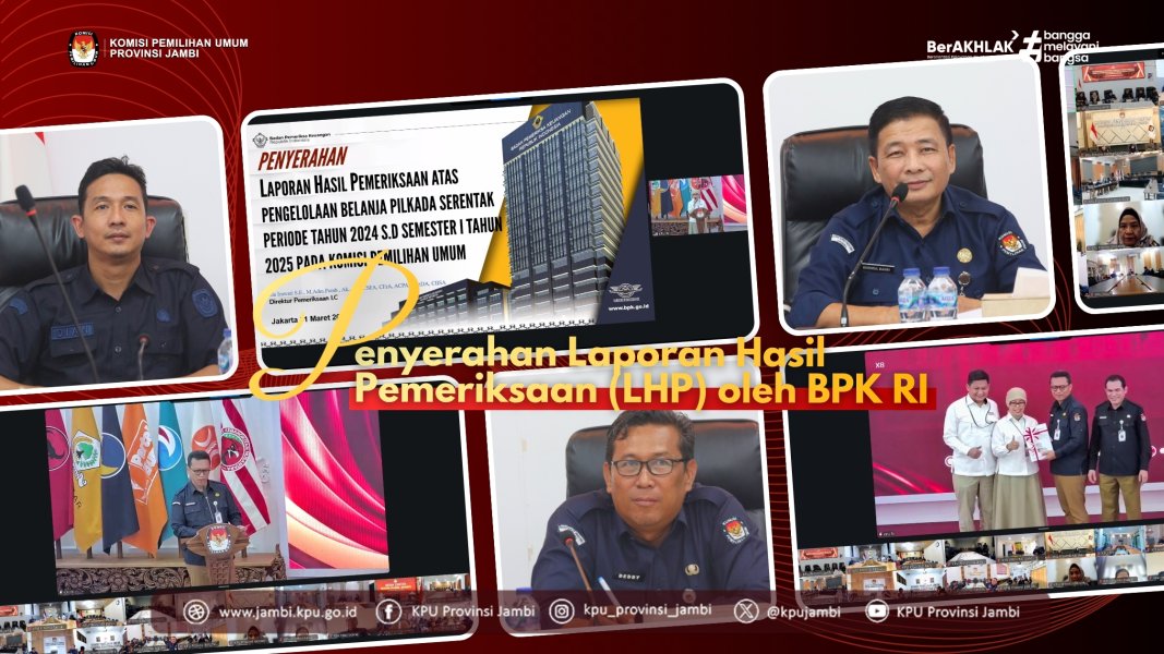 #temanpemilih, Komisi Pemilihan Umum Provinsi Jambi mengikuti Zoom Meeting yang diselenggarakan oleh KPU RI dalam rangka Penyerahan Laporan Hasil Pemeriksaan (LHP) Kepatuhan atas Pengelolaan Belanja Pemilihan Kepala Daerah Serentak Tahun 2024 oleh BPK RI, dan diikuti oleh Sekretaris KPU Provinsi Jambi beserta jajaran dan dilaksanakan di Aula KPU Provinsi Jambi, Selasa (31/03/26).