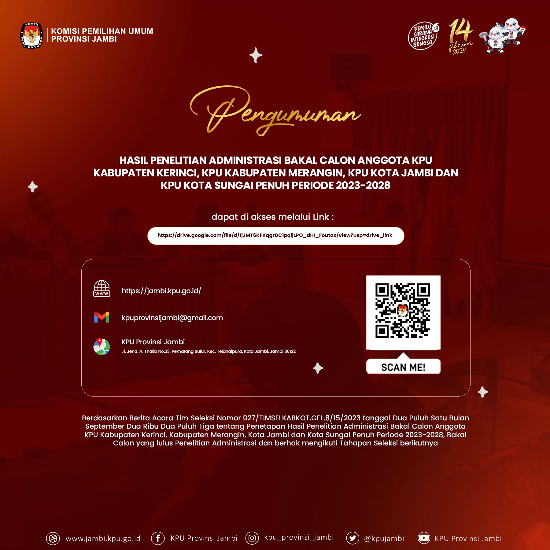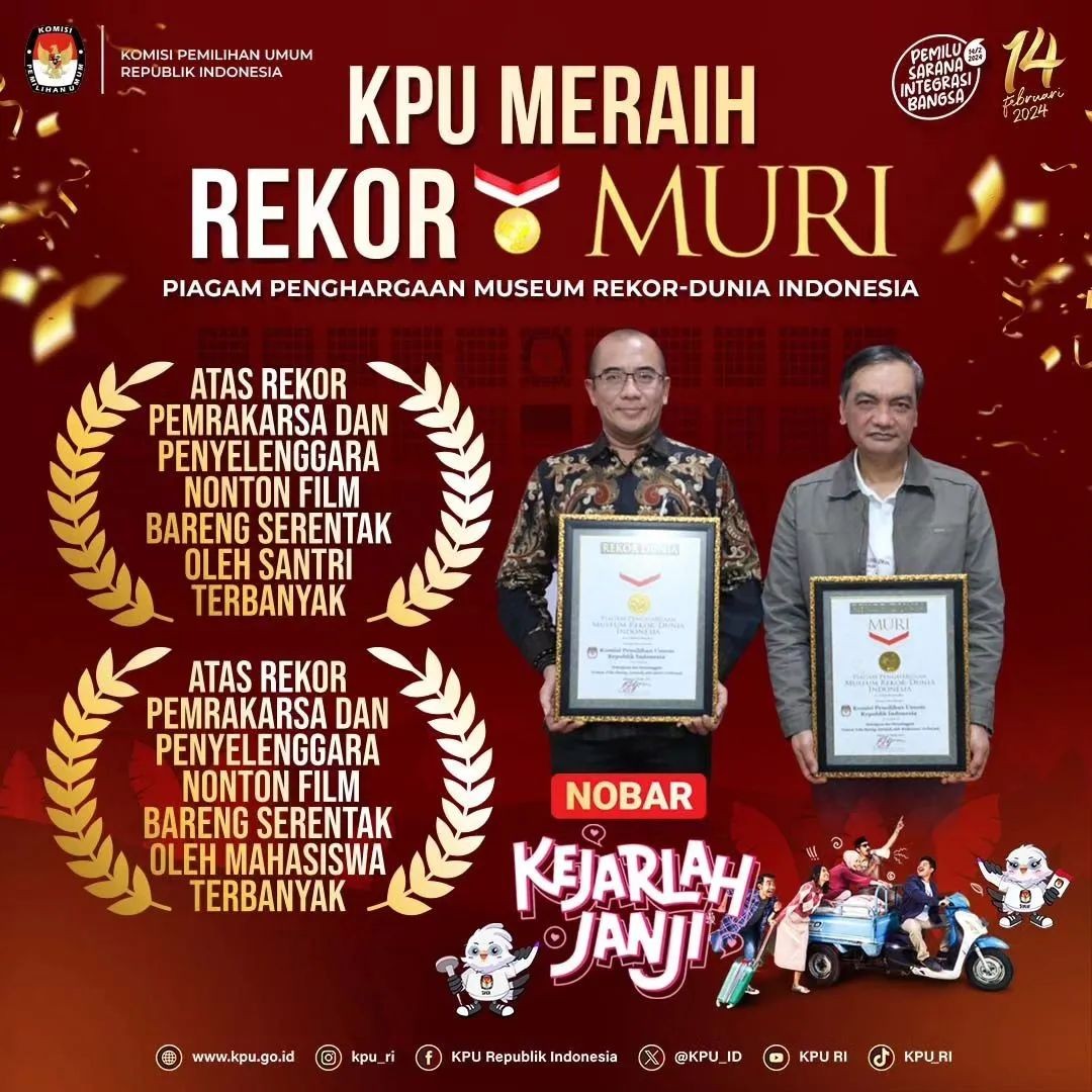 KPU sangat mengapresiasi pemberian rekor MURI ini. Semoga film “Kejarlah Janji” bisa menjadi tontonan dan tuntunan masyarakat menghadapi Pemilu 2024,” pungkasnya. Sebagai Informasi, MURI atau Museum Rekor Dunia-Indonesia adalah lembaga pencatat rekor pertama di Indonesia yang diprakarsai oleh Jaya Suprana. MURI hadir sejak tahun 1990 dengan tujuan untuk memberikan apresiasi terhadap seluruh karsa dan karya superlatif yang diciptakan oleh putra-putri Indonesia, juga menjadi sarana pencatat sejarah yang selalu menginspirasi profesionalisme dan integritas generasi penerus. [humas kpu]