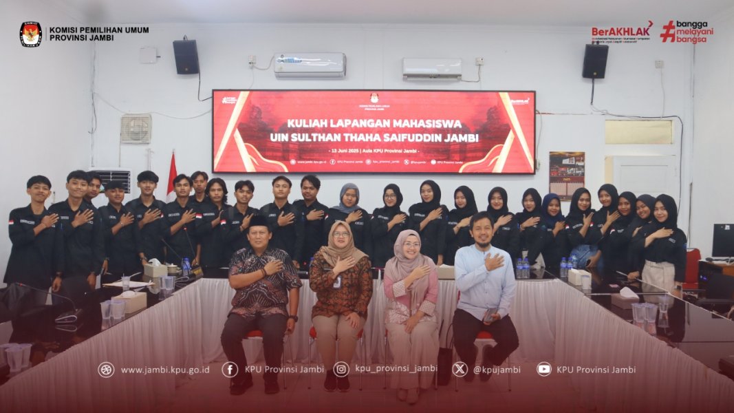 Jambi, #temanpemilih, KPU Provinsi Jambi menyambut hangat kunjungan mahasiswa semester 2 Jurusan Ilmu Pemerintahan dari UIN Sultan Thaha Saifuddin Jambi dalam kegiatan kuliah lapangan bertema kepemiluan. Kegiatan ini turut didampingi oleh dosen pengampu, Ibu Nisaul Fadilah, M.Si, Ph.D. Pada hari Jum'at (13/06/2025). Rombongan diterima langsung oleh Ketua Divisi Sosdiklih Parmas dan SDM, Edison, Ketua Divisi Perencanaan Data dan Informasi, Fahrulrozi, Ketua Divisi Hukum Suparmin, Kabag Parmas dan SDM, serta Kasubbag Parmas. Dalam pemaparannya, Edison menekankan pentingnya mahasiswa untuk terus membuka wawasan dan berperan aktif mengawal demokrasi. Sementara itu, Fahrul Rozi menjelaskan peran KPU dalam menjamin validitas data pemilih yang mencapai 2,6 juta jiwa melalui proses panjang dari DP4 hingga penetapan DPT. Suparmin mendorong Mahasiswa untuk mengambil peran penting dalam proses penyelenggaraan Pemilu, seperti menjadi PPK, PPS atau KPPS sebagai bentuk partisipasi politik sejak usia muda yang akan bermanfaat sebagai pengalaman di masa depan. Kegiatan ini menjadi momen edukatif dalam mengenalkan peran strategis KPU sebagai penyelenggara Pemilu dan Pilkada di tingkat provinsi.