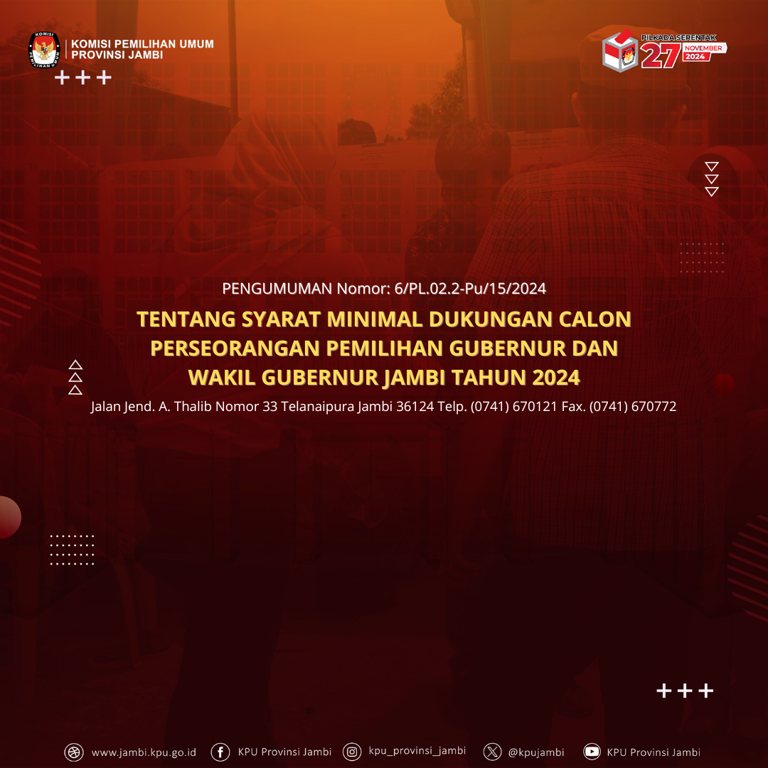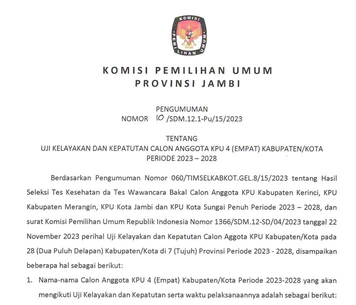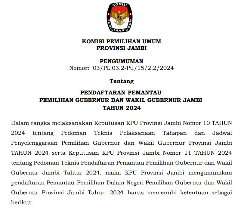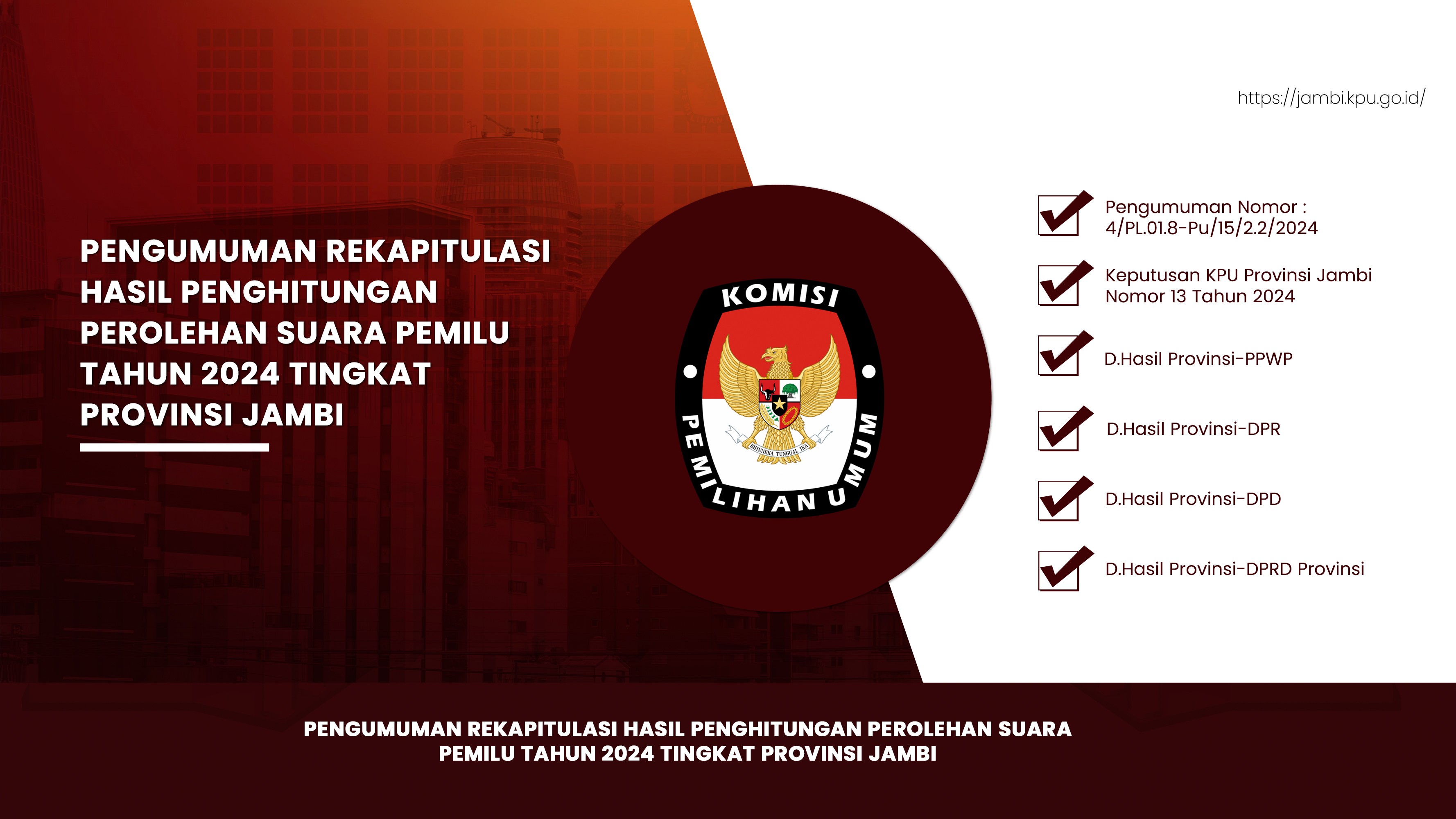Pengumuman Nomor : 4/PL.01.8-Pu/15/2.2/2024 Tentang Rekapitulasi Hasil Penghitungan Perolehan Suara Pemilu Serentak Tahun 2024 Tingkat Provinsi Jambi, Unduh di Sini
