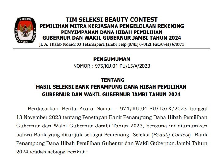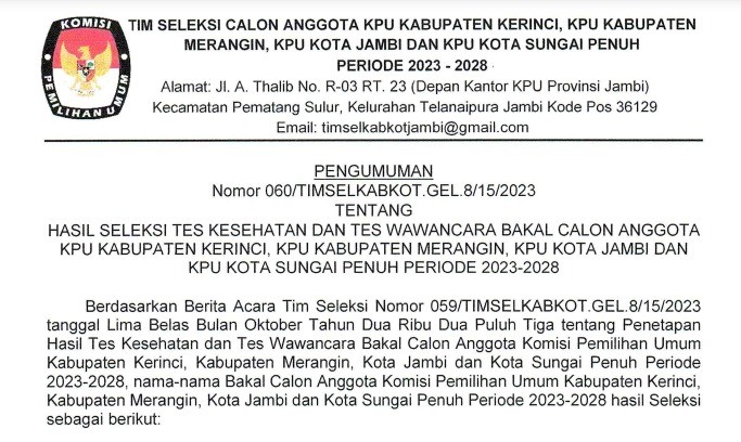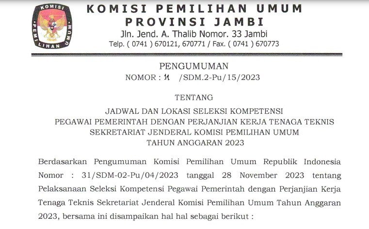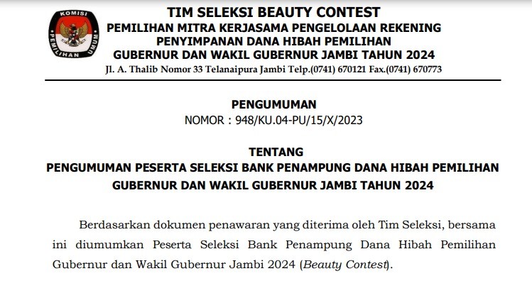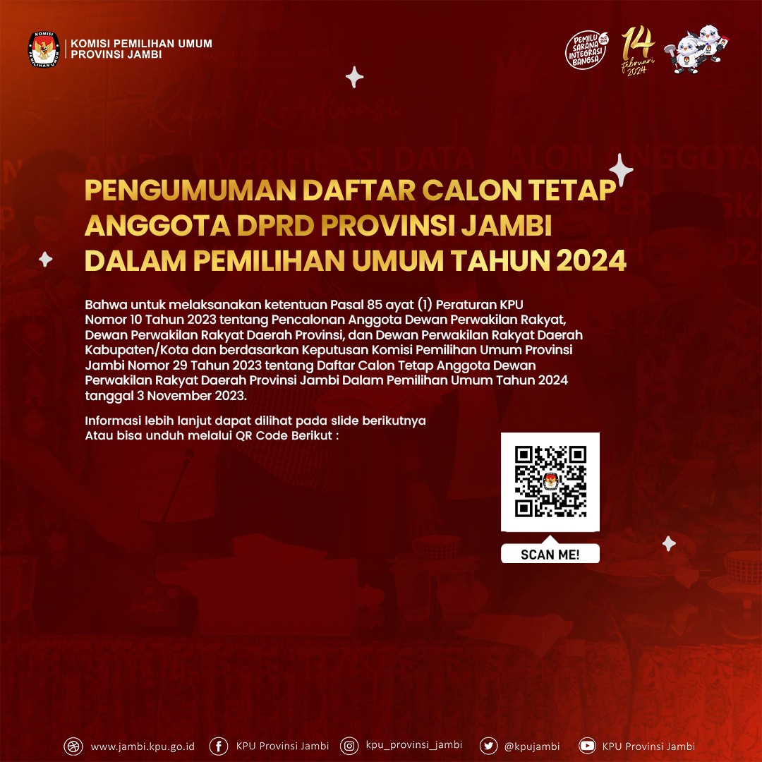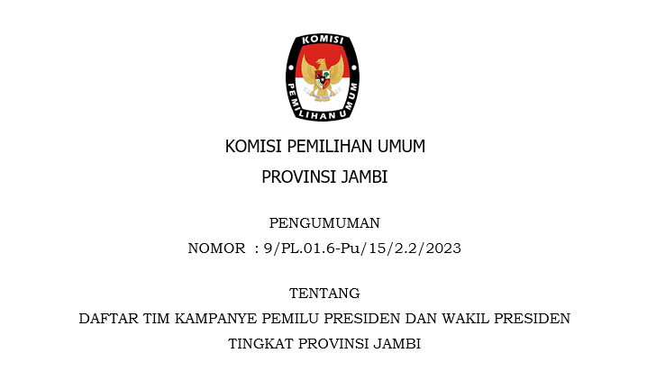 PENGUMUMAN NOMOR : 9/PL.01.6-Pu/15/2.2/2023 TENTANG DAFTAR TIM KAMPANYE PEMILU PRESIDEN DAN WAKIL PRESIDEN TINGKAT PROVINSI JAMBI Dalam rangka melaksanakan pasal 12 Peraturan Komisi Pemilihan Umum Nomor 15 Tahun 2023 tentang Kampanye Pemilihan Umum sebagaimana diubah terakhir dengan Peraturan Komisi Pemilihan Umum Nomor 20 Tahun 2023 tentang Perubahan atas Peraturan Komisi Pemilihan Umum Nomor 15 Tahun 2023 tentang Kampanye Pemilihan Umum, Komisi Pemilihan Umum Provinsi Jambi mengumumkan nama tim Kampanye Pemilu Presiden dan Wakil Presiden nomor urut 1 (Anies Rasyid Baswedan dan A. Muhaimin Iskandar), Nomor urut 2 (Prabowo Subianto dan Gibran Rakabuming Raka), Nomor urut 3 (Ganjar Pranowo dan Mohammad Mahfud Mahmodin) tingkat Provinsi Jambi pada papan pengumuman dan/atau laman Komisi Pemilihan Umum Provinsi Jambi. Pengumuman dapat diakses melalui papan pengumuman pada kantor Komisi Pemilihan Umum Provinsi Jambi yang beralamat di Jalan Jendral A. Thalib Nomor 33 Kota Jambi. Pengumuman juga dapat diakses melalui tautan berikut Klik Disini