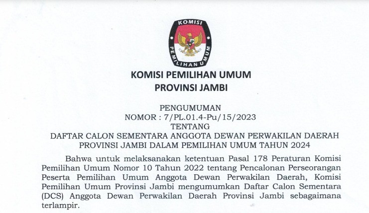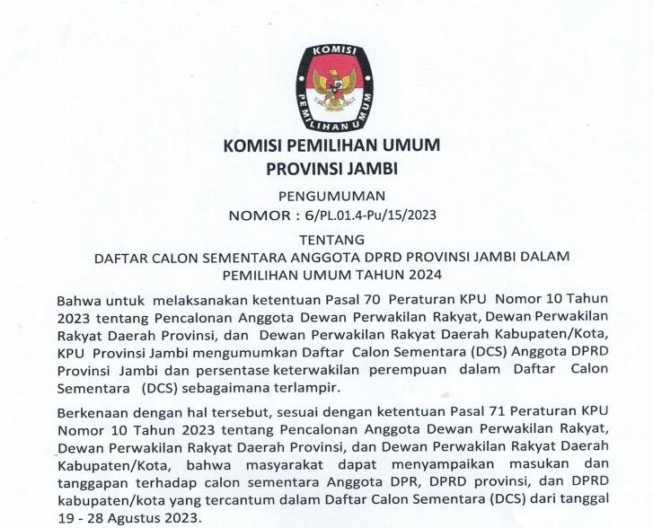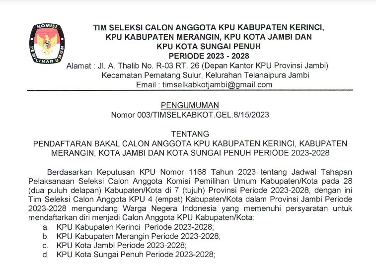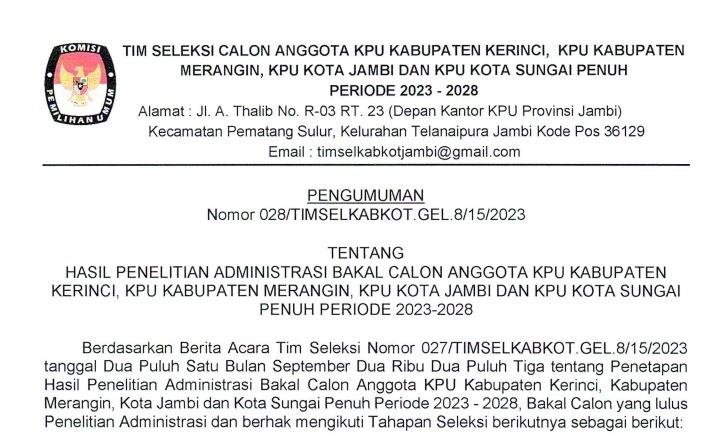 Berdasarkan Berita Acara Tim Seleksi Nomor 040/TIMSELKABKOT.GEL.8/15/2023 tanggal Lima Bulan Okotober Dua Ribu Dua Puluh Tiga tentang Penetapan Hasil Seleksi Tertulis dan Tes Psikologi Bakal Calon Anggota KPU Kabupaten Kerinci, Kabupaten Merangin, Kota Jambi dan Kota Sungai Penuh Periode 2023 - 2028, Bakal Calon yang lulus Seleksi Tertulis dan Tes Psikologi dan berhak mengikuti Tahapan Seleksi berikutnya sebagai berikut: