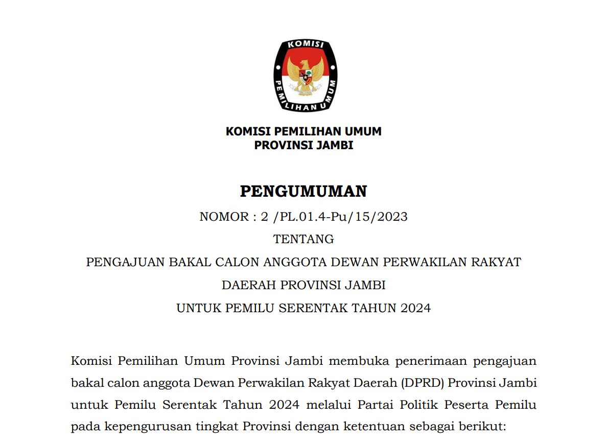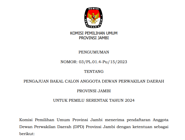 Dapat disampaikan bahwa hasil rekapitulasi daftar pemilih tetap (DPT) untuk pemilu 2024 Provinsi Jambi adalah Laki Laki : 1.350.151, Perempuan : 1.325.956 dan jumlah total sebanyak 2.676.107 Pemilih.