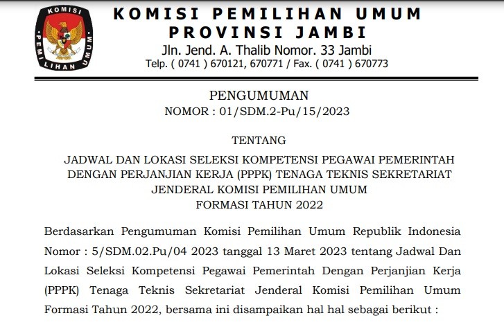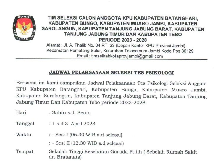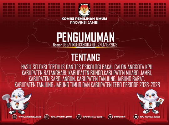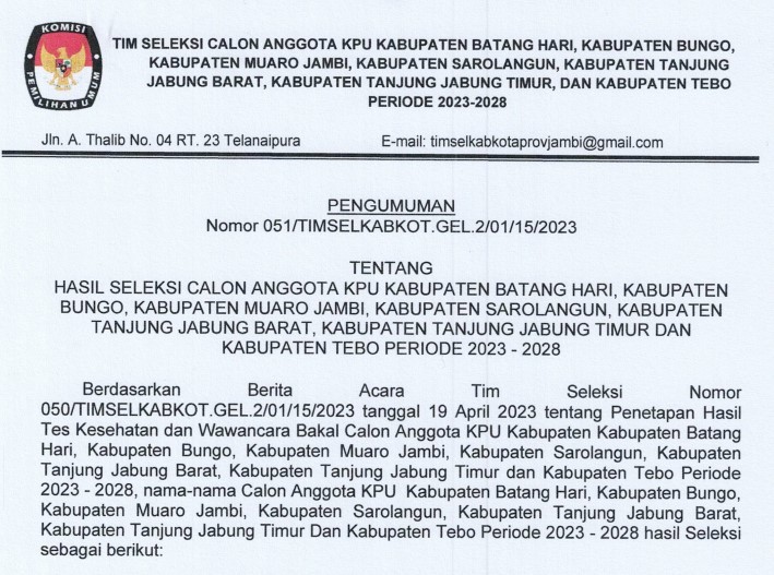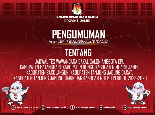 Menghubung Pengumuman Nomor : 035/TIMSELKABKOT.GEL.2/01/15/2023 tentang Hasil Seleksi Tertulis dan Tes Psikologi Bakal Calon Anggota KPU Kabupaten Batang Hari, Kabupaten Bungo, Kabupaten Muaro Jambi, Kabupaten Sarolangun, Kabupaten Tanjung Jabung Barat, Kabupaten Tanjung Jabung Timur dan Kabupaten Tebo Periode 2023 - 2028, Bersama ini kami mengundang saudara/i untuk mengikuti tes wawancara calon anggota KPU Kabupaten dalam Provinsi Jambi.