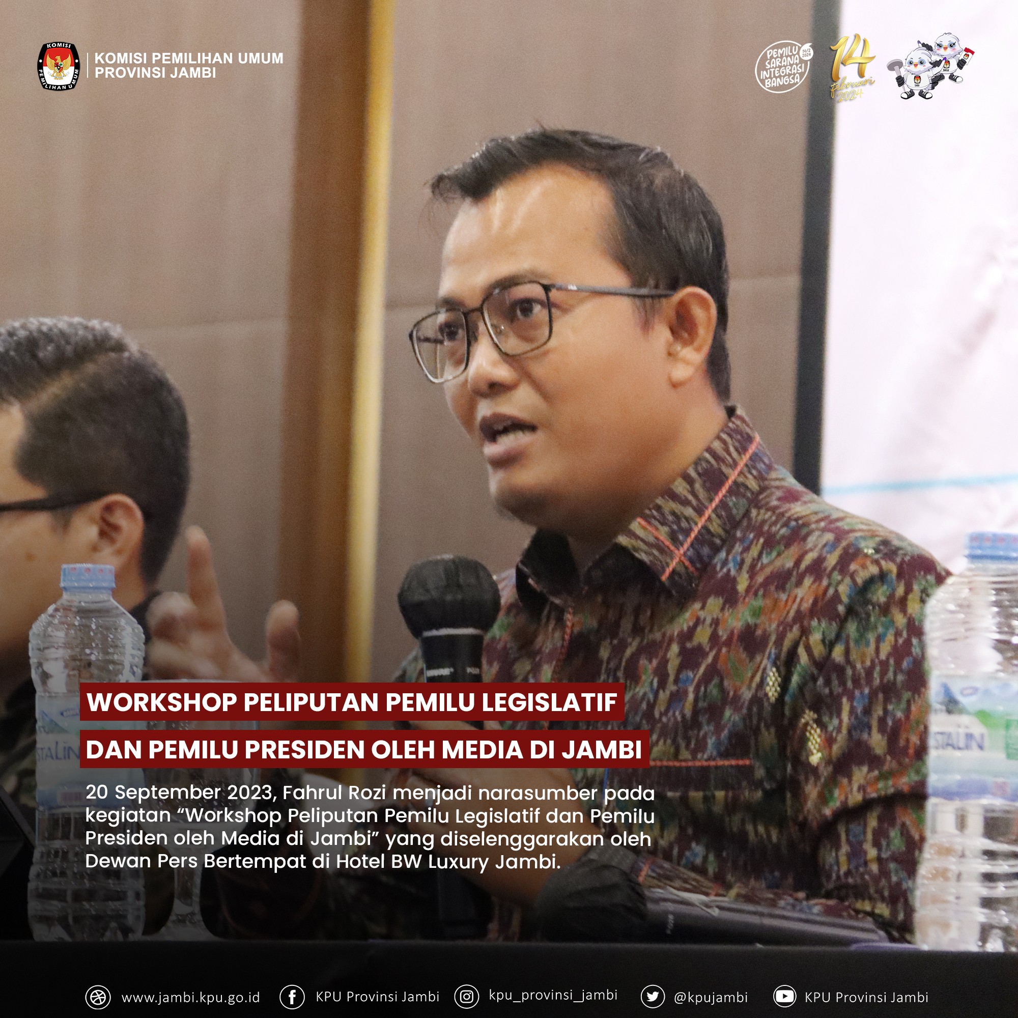 Anggota Komisi Pemilihan Umum Provinsi Jambi Divisi Perencanaan, Data dan Informasi Fahrul Rozi menjadi narasumber pada kegiatan “Workshop Peliputan Pemilu Legislatif dan Pemilu Presiden oleh Media di Jambi” yang diselenggarakan oleh Dewan Pers Bertempat di Hotel BW Luxury Jambi, Rabu, 20 September 2023. Kegiatan dibuka secara daring oleh Ketua Dewan Pers, Ninik Rahayu. Dalam sambutannya Indonesia akan menggelar Pemilu Legislatif, Pemilu Presiden dan juga Pemilihan Kepala Daerah (Pilkada) selanjutnya disebut Pemilu 2024. Salah satu kunci sukses penyelenggaraan ajang demokrasi tersebut adalah terciptanya ruang publik yang kondusif, sehat, dan bersih dari berita palsu (fake news) serta hoaks. Kemudian dilanjutkan Paparan oleh Divisi Perencanaan Data dan Informasi Fahrul Rozi, dalam arahannya menyampaikan terkait dengan Tahapan Pemilu yang sedang berlangsung, Fahrul Rozi juga mengajak semua Media Pers untuk bersama mensukseskan Pemilu 2024. Pers memegang peranan penting dan harus berada di garda terdepan dalam memenuhi ruang publik dengan berita-berita yang mencerahkan. Sebagai The Fourth Estate of Democracy (pilar keempat demokrasi) sebagaimana dikatakan Edmund Burke sekitar dua setengah abad lalu, pers juga harus bisa menggerakkan partisipasi warga dalam Pemilu dan membangun demokrasi yang berkualitas dan bermartabat. Peserta Workshop Peliputan Pemilu 2024 mewakili unsur wartawan, editor hingga pemimpin redaksi, penyelenggara Pemilu, aparat penegak hukum, partai politik (peserta Pemilu), asosiasi perusahaan pers, organisasi profesi wartawan, Konstituen Dewan Pers, serta masyarakat umum. Rabu. (20/23).