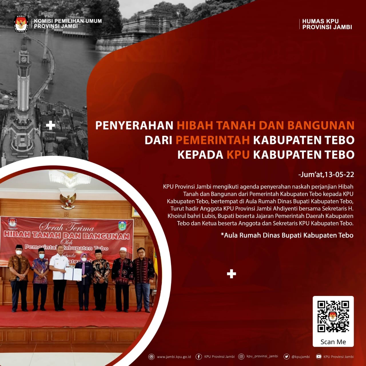 Jambi - KPU Provinsi Jambi mengikuti agenda penyerahan naskah perjanjian Hibah Tanah dan Bangunan secara simbolis dari Pemerintah Kabupaten Tebo kepada KPU Kabupaten Tebo, bertempat di Aula Rumah Dinas Bupati Kabupaten Tebo, pada hari Jum’at, (13/05).