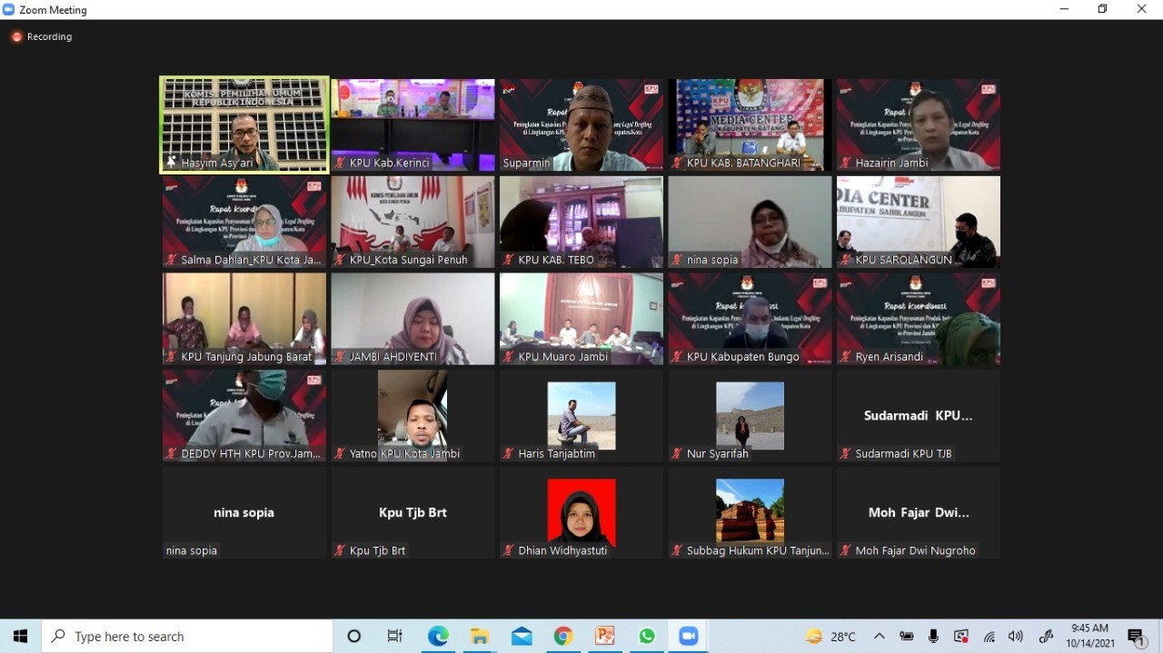 Dalam rangka mencegah terjadinya sengketa atau permasalahan yang diakibatkan kesalahan dalam penyusunan produk hukum. Maka Komisi Pemilihan Umum (KPU) Provinsi Jambi pada Kamis (14/10), menyelenggarakan kegiatan peningkatan kapasitas penyusunan produk hukum atau legal drafting bagi KPU Kabupaten/Kota se Provinsi Jambi. Menurut Ketua Divisi Hukum dan Pengawasan KPU Provinsi Jambi, Suparmin, S.H, M.H kegiatan tersebut menghadirkan anggota KPU RI, Hasyim Asy'ari dan Kepala Biro Perundang-Undangan Setjen KPU RI, Nur Syarifah. ''Kita lakukan peningkatan kapasitas atau kemampuan penyusunan produk hukum bagi KPU Kabupaten/Kota secara virtual, tadi pagi,'' ujar Suparmin. Dijelaskannya, dengan kegiatan tersebut nantinya tidak lagi terjadi kesalahan dalam penyusunan produk hukum, berupa keputusan KPU Kabupaten/Kota ataupun produk hukum lainnya. ''Sehingga bisa mencegah terjadinya permasalahan hukum baru, seperti pelanggaran administrasi, sengketa Tata Usaha Negara hingga ke masalah etik,'' lanjut mantan Jurnalis ini. ''Beberapa materi yang disampaikan pak Hasyim Asy'ari tadi antara lain mengenai norma hukum dan hierarki peraturan perundang-undangan di Indonesia, asas pembentukan dan materi muatan peraturan perundang-undangan dan beberapa materi lainnya,'' imbuh Suparmin.
