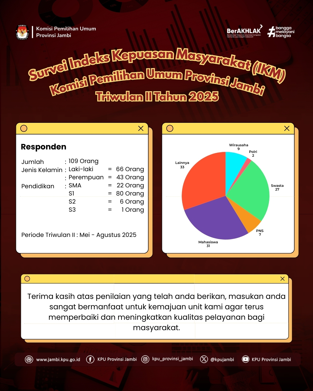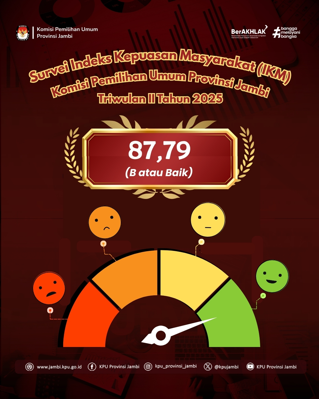 Terima kasih atas partisipasi dan masukan masyarakat Provinsi Jambi yang telah berpartisipasi dalam pengisian Survei Kepuasan Masyarakat di Sekretariat KPU Provinsi Jambi. Hasil Indeks Kepuasan Masyarakat terhadap pelayanan di Sektretariat KPU Provinsi Jambi yaitu 87,79, yang termasuk dalam kategori "BAIK". Semoga kedepannya KPU Provinsi Jambi dapat terus meningkatkan kualitas dan kinerja pelayanan kepada masyarakat.